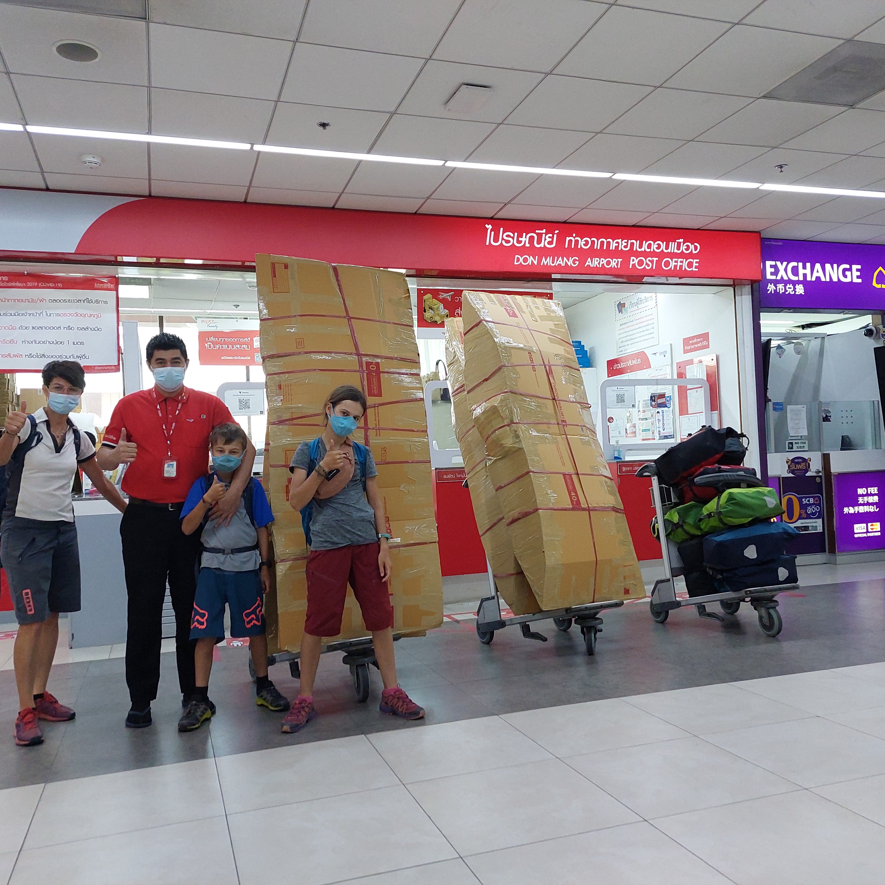Et c'est parti pour 50 kilomètres de vélo d'un aéroport (Suvarnabhumi) à l'autre (Don Muang), avec une circulation d'enfer. On met les trax pour tirer les enfants, et on reste très attentif à tous ces véhicules qui nous entourent. On a prévu d'être tôt à l'aéroport, pour trouver une solution pour emballer nos vélos. Bien nous en a pris. Avec le covid, l'aéroport est casi désert, les points d'emballages de bagages ont été supprimés, très peu de personnel...mais la providence, la compagnie nous envoie à la poste de l'aéroport. Le responsable absolument fantastique nous assure pouvoir empaqueter nos 4 vélos de manière sécurisée, en 2 heures de temps, pour 70 dollars. Yes ! et le travail démarre, le personnel de la poste est drillé pour empaqueter les objets, ils nous font un travail de pro, avec l'aide de Nils et toute la famille. Quel soulagement ! et quelles rencontres ! un peu d'énergie positive réemmagasinée ! ....